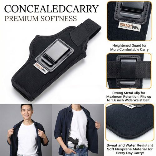 GunAlly Neoprene IWB Concealed Holster is almost unquestionably the most popular carry type. The concealed carrying holster is designed for right-handed users to keep their guns safe and within arm’s reach. Its open-top design means fast, low-noise, and no-hindrance access to your weapon, and its neoprene fabric construction makes for a comfortable concealed stretcher. Equipped with a steel clip for 1.5 ” wide belts. Available in 3 sizes to fit most guns. This IWB holster is easily hidden in most untucked tees and button-downs, and throwing on a jacket gives you even more freedom. It’s lightweight, secure, and keeps your gun protected. The holster attaches to the waistband with a 1.5” belt clip.