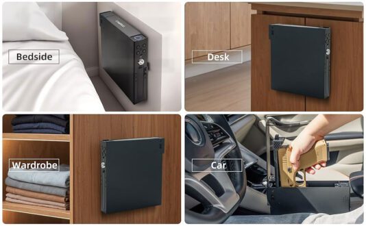 Universal Fit: The compact design fits most handguns, including those with a spare magazine. It’s suitable for large sedans, SUVs, trucks, and even for use as a nightstand safe.