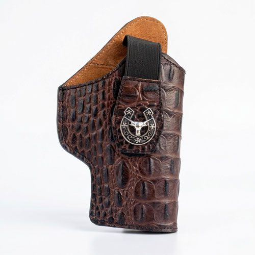 Distinctive Hardware: The holster is accented with a detailed, silver-toned metal concho featuring a longhorn steer nestled within a lucky horseshoe, adding a touch of classic western flair.